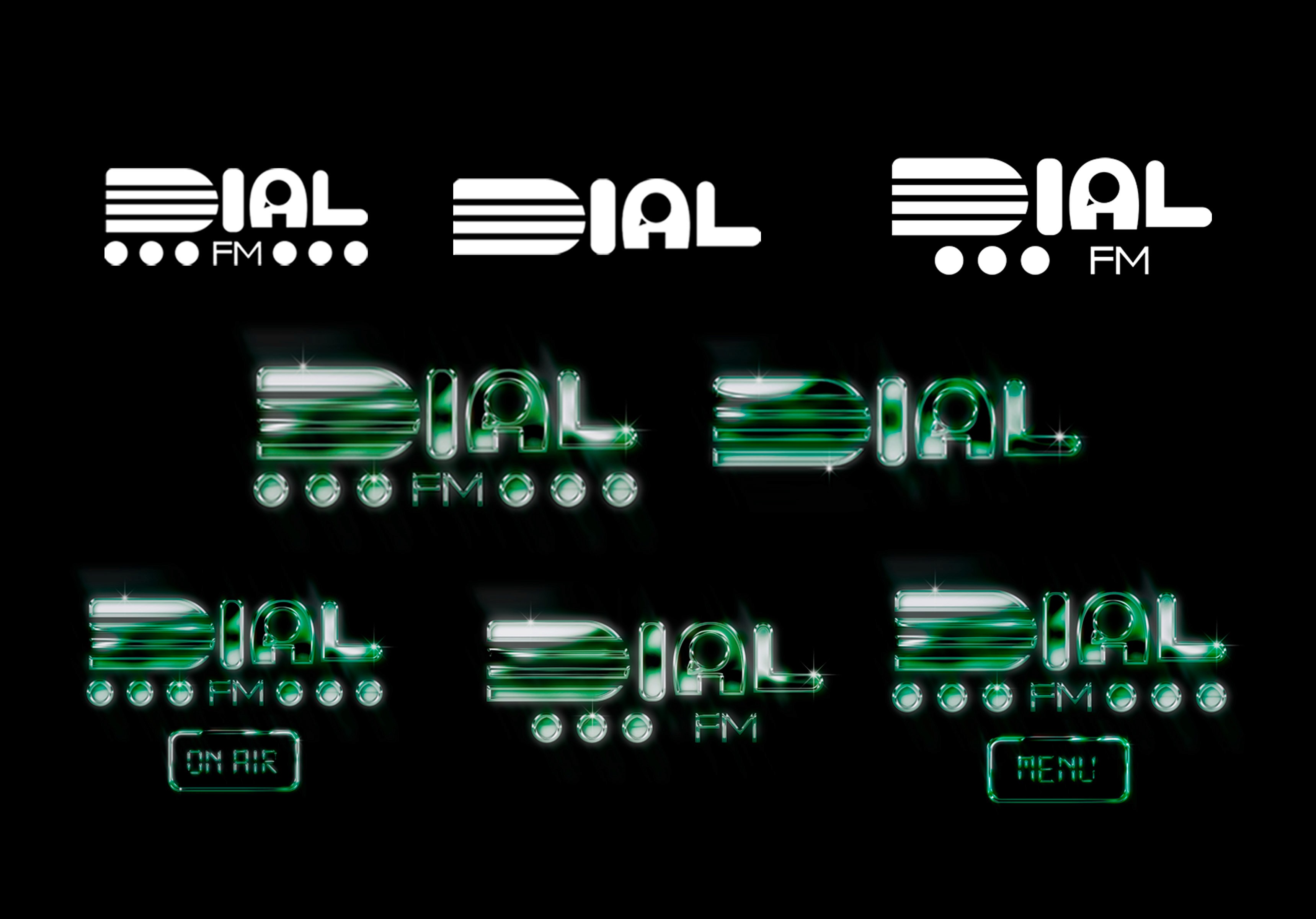 The name Dial FM comes from the use of dials that are constantly used when using a radio along with the term FM to mimic a local radio station. The logo itself is inspired by a mixed blend of typography logos from old local news and radio stations from the early 2000s with the glowing green to add to the reminiscent colorful tone from branding of that time. There are at least a couple of variations of the logo, each one featuring somewhere within the restaurant’s branding. One version of the logo comes in a 3D Loop that patrons can see in additional advertisements for the brand.