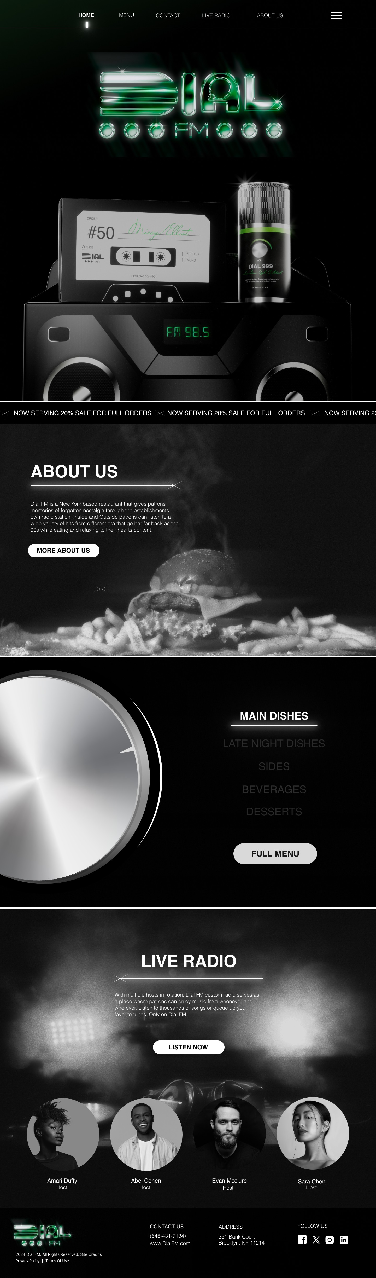 Dial FM’s website consists of a homepage that shows a true mockup hero image of the brand’s packaging, with a header menu mimicking the rotation of a radio system that glows and turns when on a specific page of the website. It also consists of an about us tile, a condensed version of the menu where depending on what the customer would like to see on the menu has a dial on the side that will turn, and a slide of a restaurant’s live radio station and its featured hosts that patrons can immediately listen to when clicking Listen Now.