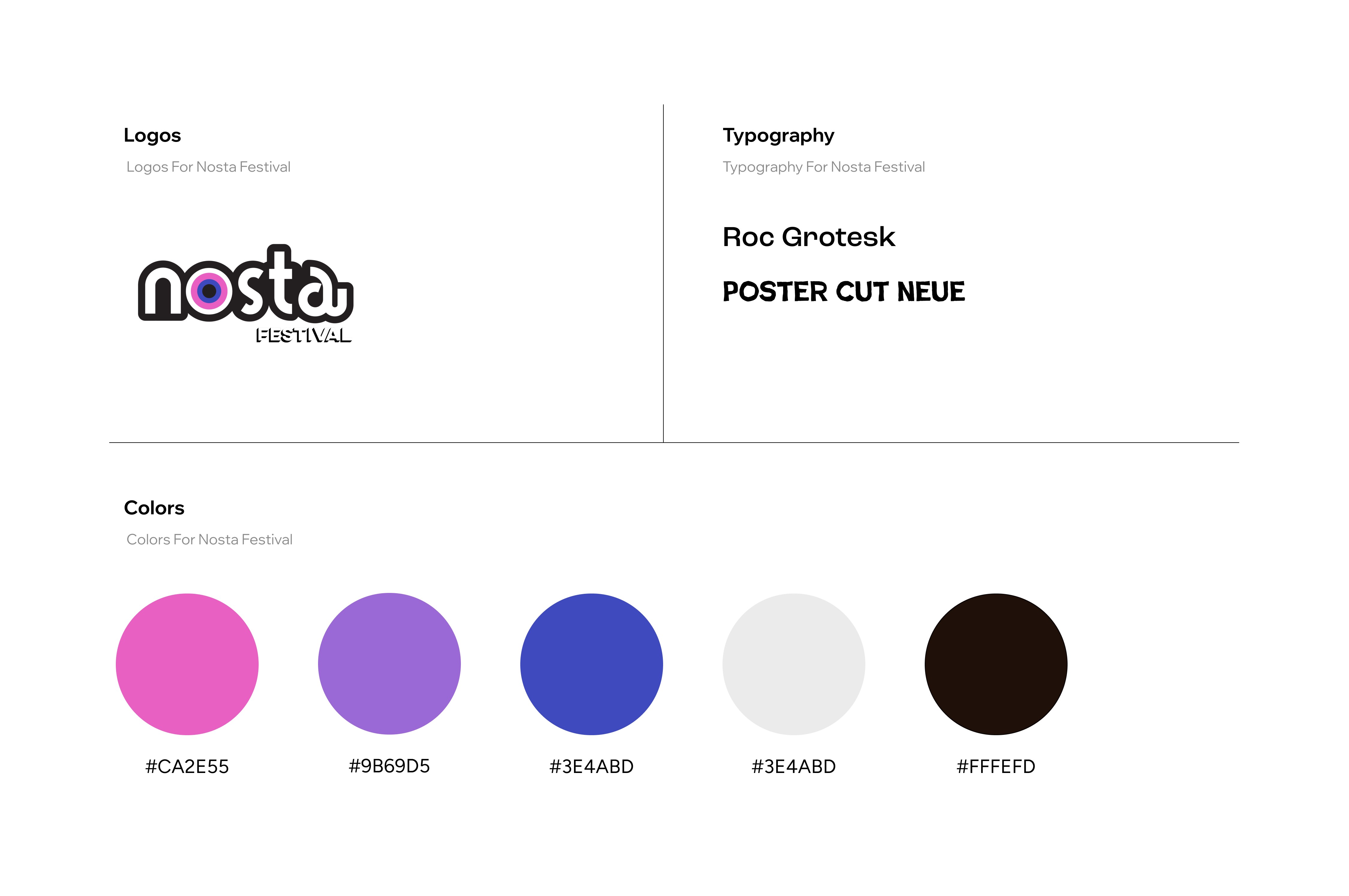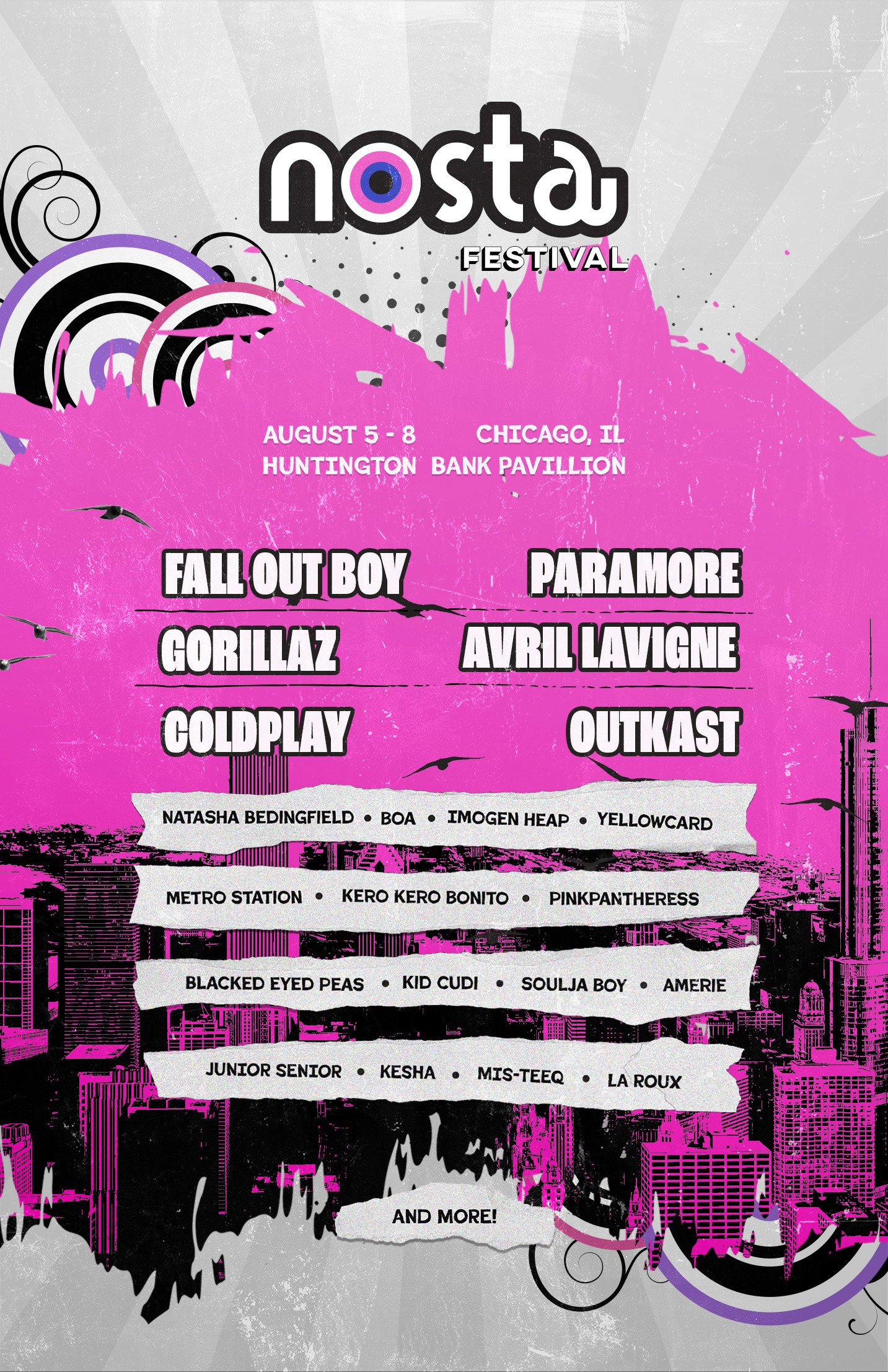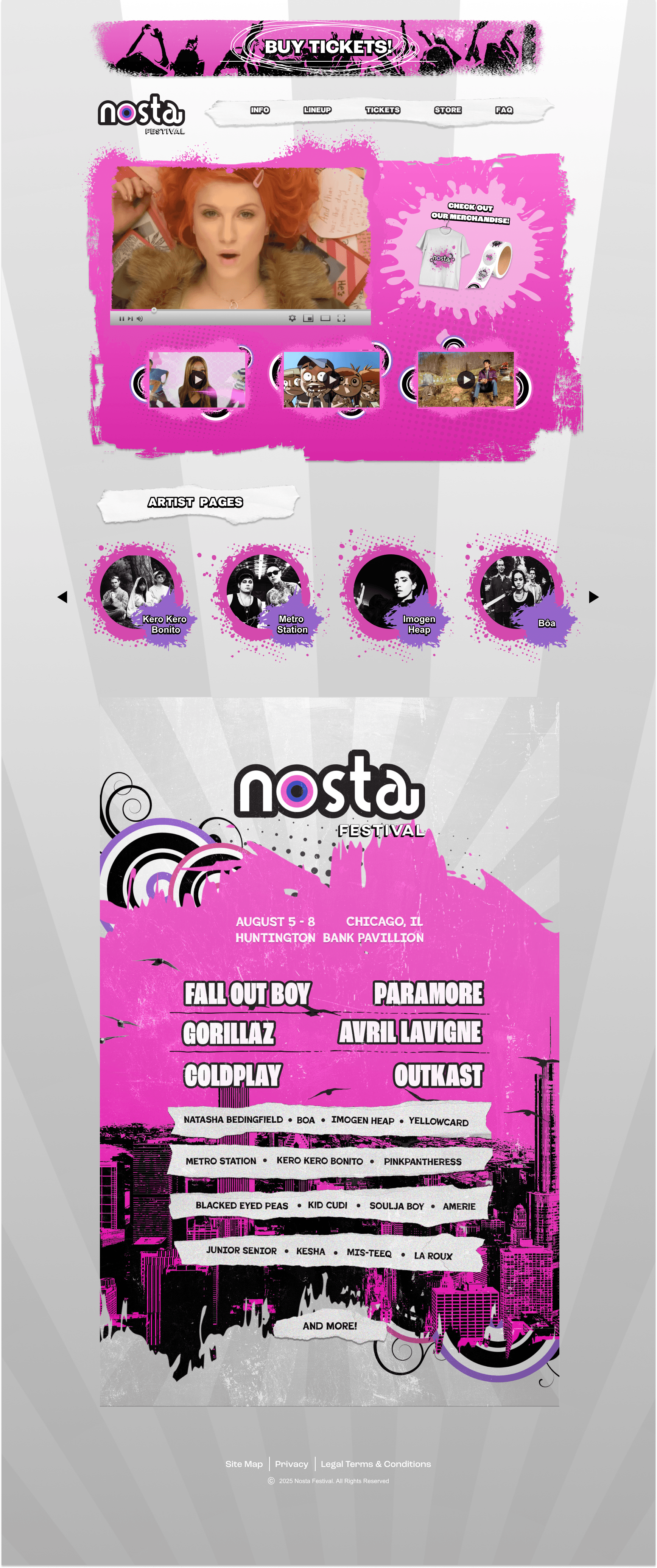 Based in Chicago, Illinois, Nosta Festival is a three day event featuring singing acts popular through the early to late 2000s with present performing artists. It’s original style is homage to the design era of frutiger metro with 2000s esque vector flourish patterns, halftone patterns, high contrast color palette.