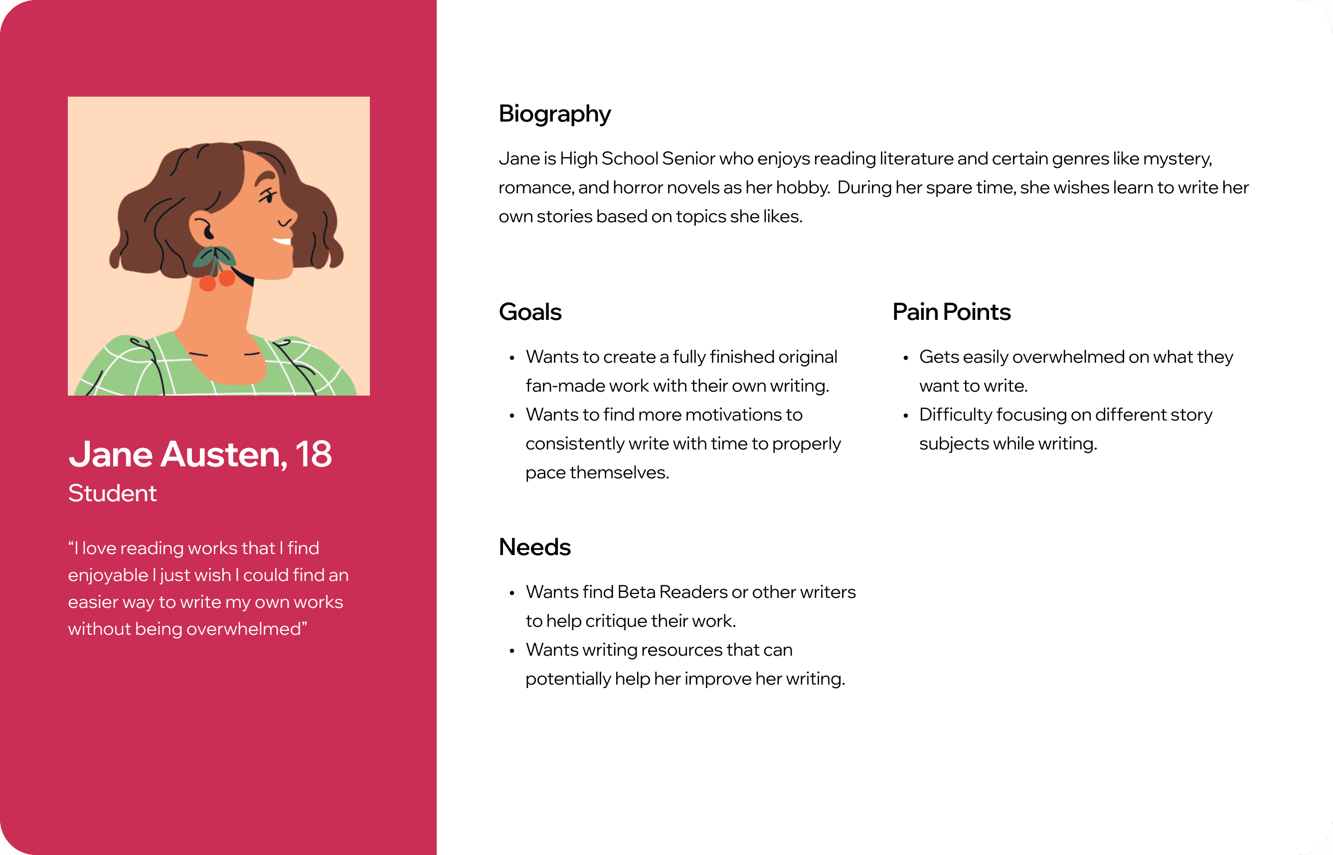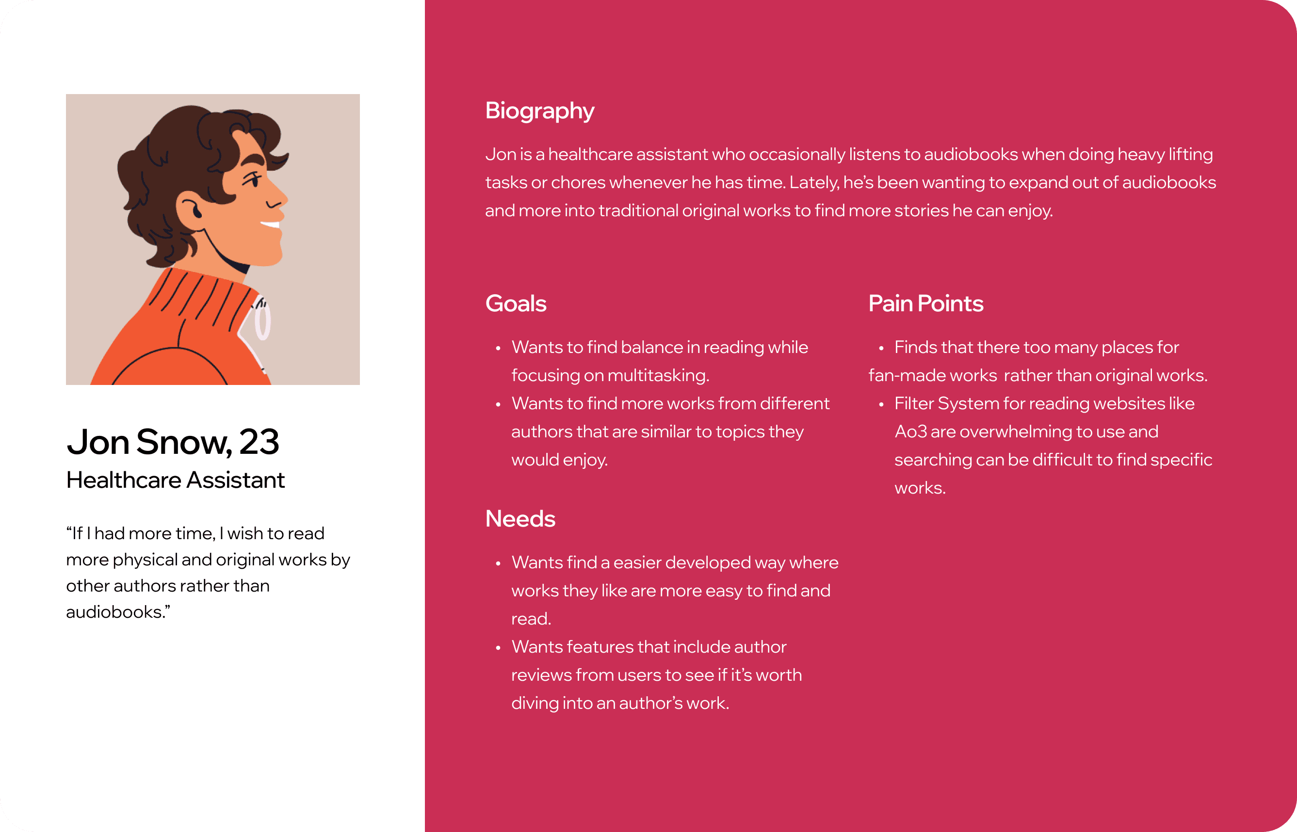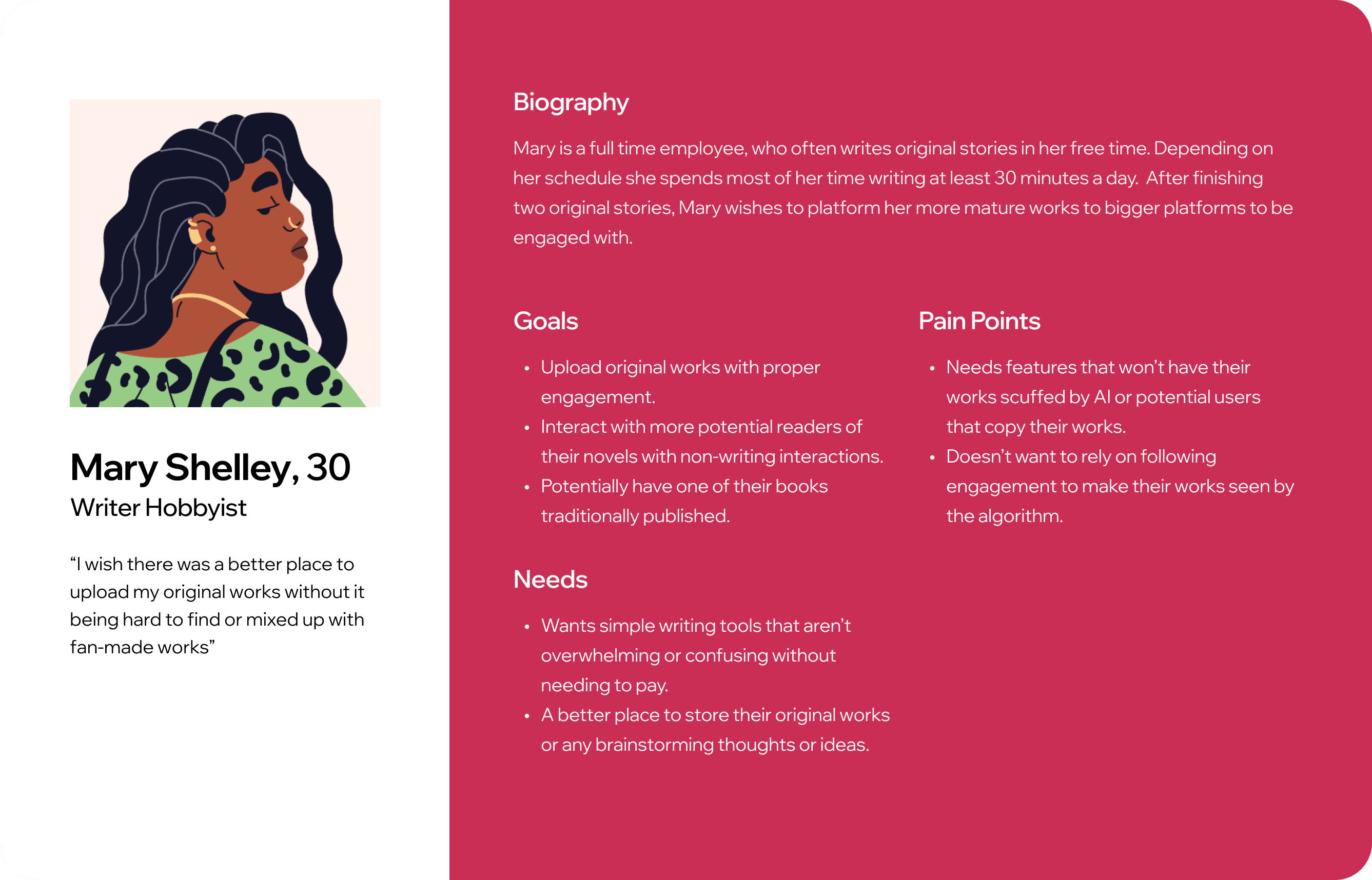 Each user persona was established through a cultivation of competitive analysis and interviews, grabbing key insights and typical mannerisms when users are reading and writing at their own volition.